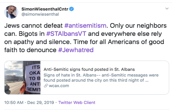 In December 2019, after a series of violent crimes against Jews in New York and New Jersey and other non-violent attacks around the country, The Simon Wiesenthal Center tweeted an assertion that non-Jews have a significant role to play in defeating anti-Semitism (see Figure 72). The center’s stated role as indicated on their website (http://www.wiesenthal.com/about/about-the-simon-wiesenthal-center/) is as follows: