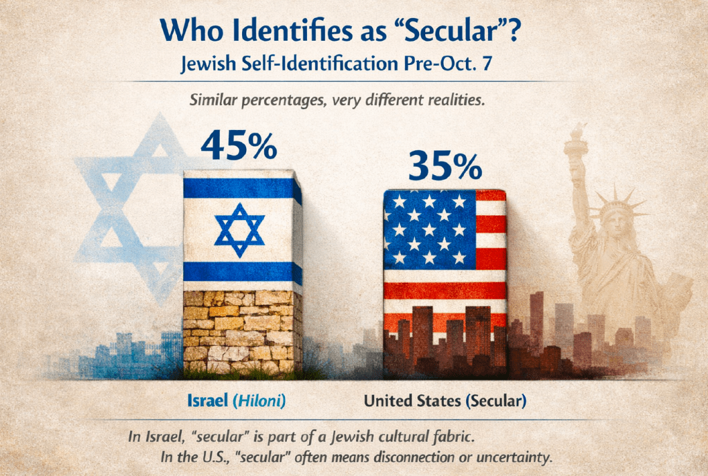 According to the Israel Central Bureau of Statistics, roughly 42–45 percent of Israeli Jews identify as secular or hiloni. On paper, that number looks similar to American Jewish data.