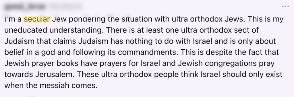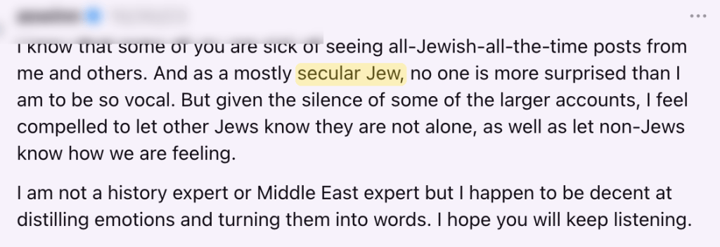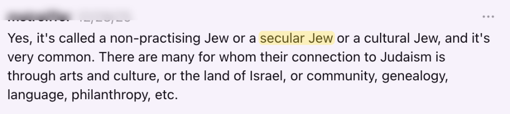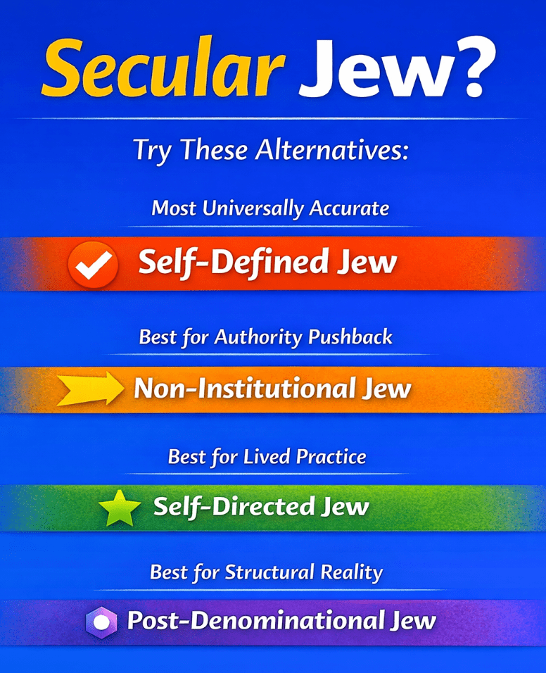 Due to the sheer number of times I have read social media posts using this identifier, and the assumptions and miscommunications that arise, I wanted to tackle its use, misuse, definitions (multiples of them), and a possible suggestion for other linguistic identifiers that are more aligned. This piece is not an attempt to redefine “secular Jew,” but to surface how differently the term is heard, used, and operationalized across contexts.
