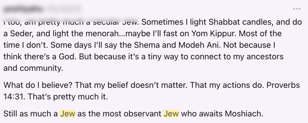 This is not me rejecting Jewish community or institutions. It is an acknowledgment that the way I live Jewishly, and the way many others do as well, does not align cleanly with the frameworks most often used to describe us.