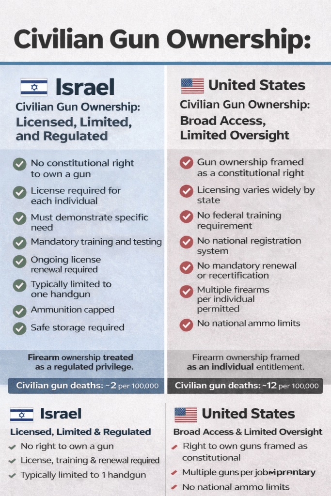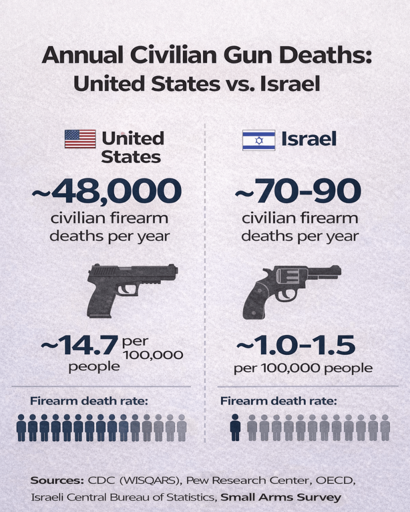 The United States experiences tens of thousands of civilian gun deaths annually. Israel’s numbers are dramatically lower, even accounting for regional conflict.