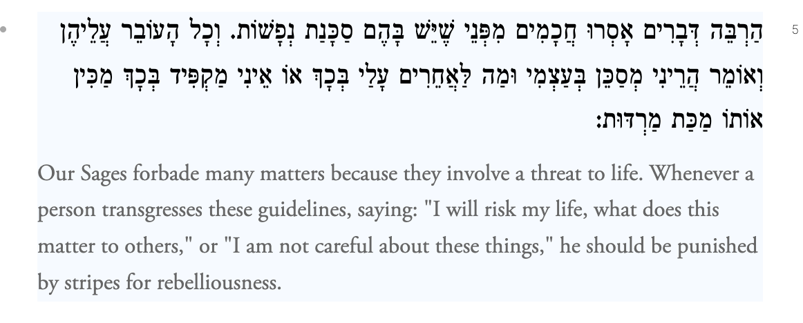 Jewish law does not treat danger as a private choice and one who does so is punished. In addition, risk imposed on others is a moral failure. Jewish law does not ask whether danger is predictable, it asks whether it is preventable.