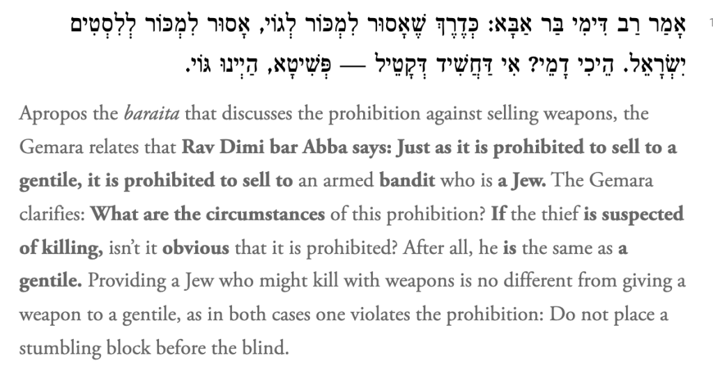 One of the clearest Jewish texts on weapons is also one of the most overlooked. The entire selection of Talmud, Avodah Zarah 15b:10 is a fascinating debate on who can buy and sell weapons and to whom they shouldn’t be sold to. But the most important part is specifically about not selling a weapon to a criminal: