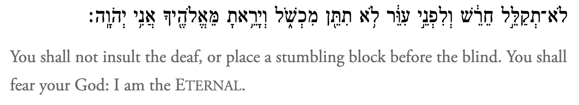 The last line in Talmud Avodah Zarah 15b:10 says, “Do not place a stumbling block before the blind.” But this is also found in Leviticus 19:14.