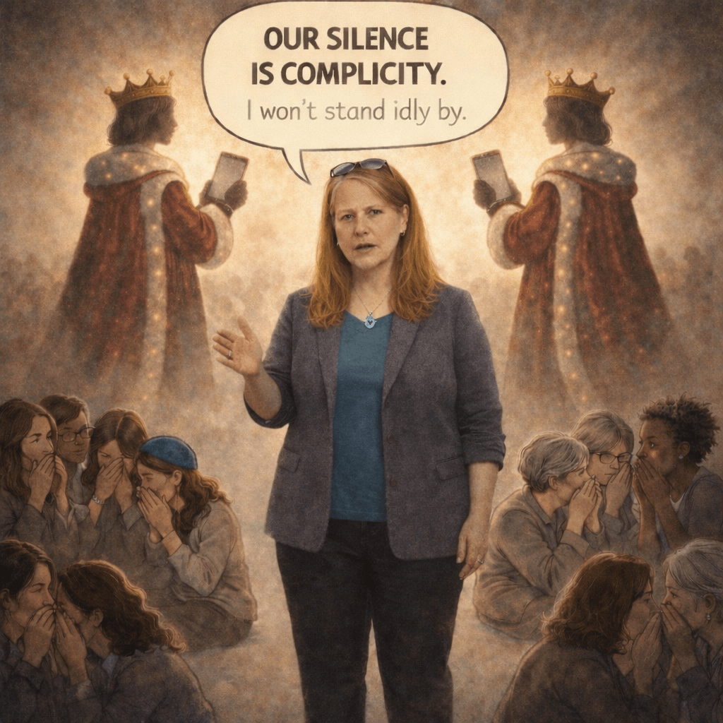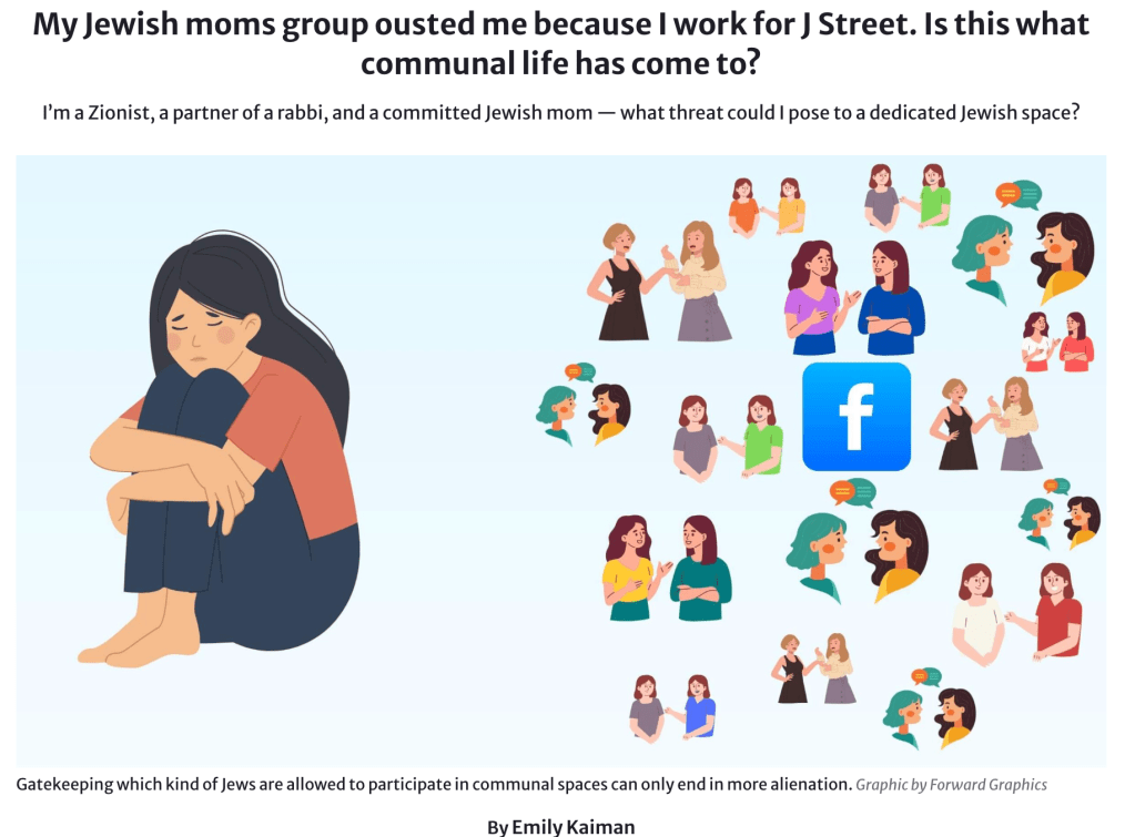 The most visible public example of this happening in our on-line Jewish women’s spaces came in April 2025, when Atlanta educator and J-Street staff member Emily Kaiman wrote in The Forward about being removed from JMOA because of her professional affiliation. She describes learning of her removal through a screenshot of a moderator’s post rather than direct communication, and being met with silence when she attempted to engage afterward.