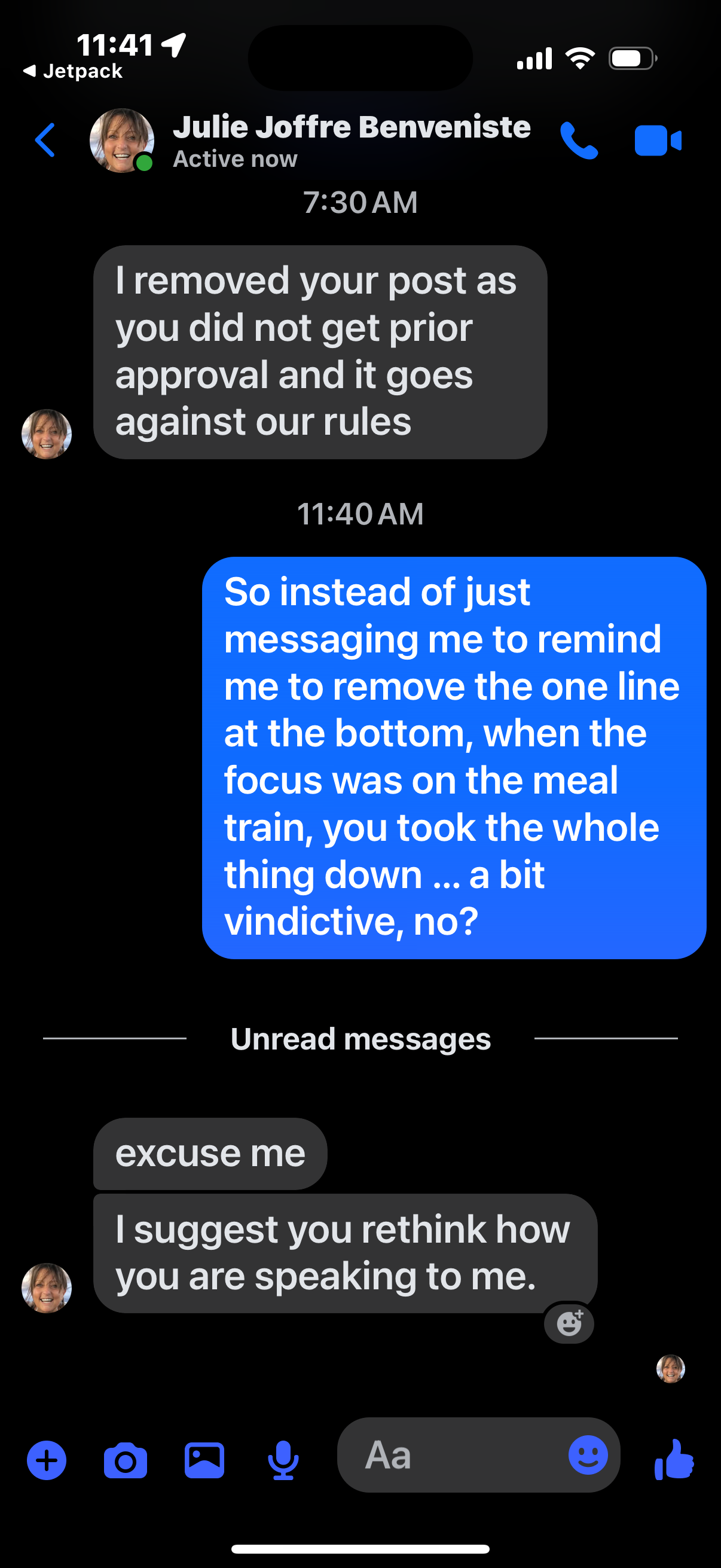 When I suggested to the admin, Julie Joffre Benveniste, that maybe the more appropriate way to handle it would be to send me a simple message: remove one line, adjust the post, and move forward with helping a family (I did include a slap remark about it being vindictive which you will understand more in a moment), her reply was based in ego and power: “I suggest you rethink how you are speaking to me.”