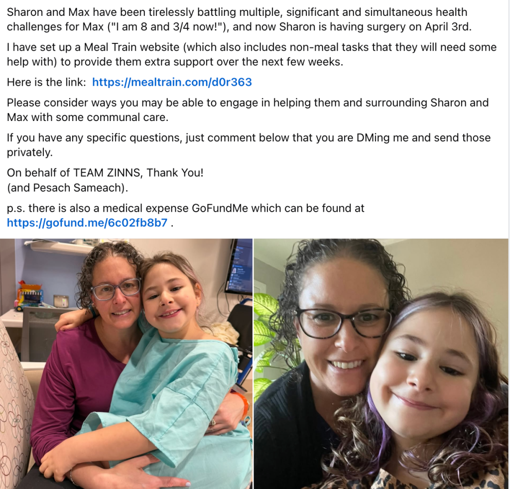 I attempted to advertise a meal train for a family in need within the Jewish Women of Atlanta (JWOA) Facebook group. It was a straightforward act of chesed and bikkur cholim, obligations for us to show up for others with care and support in a moment of vulnerability. At the very bottom of that post, I included a brief reference to the possibility of additional financial support connected to medical need.