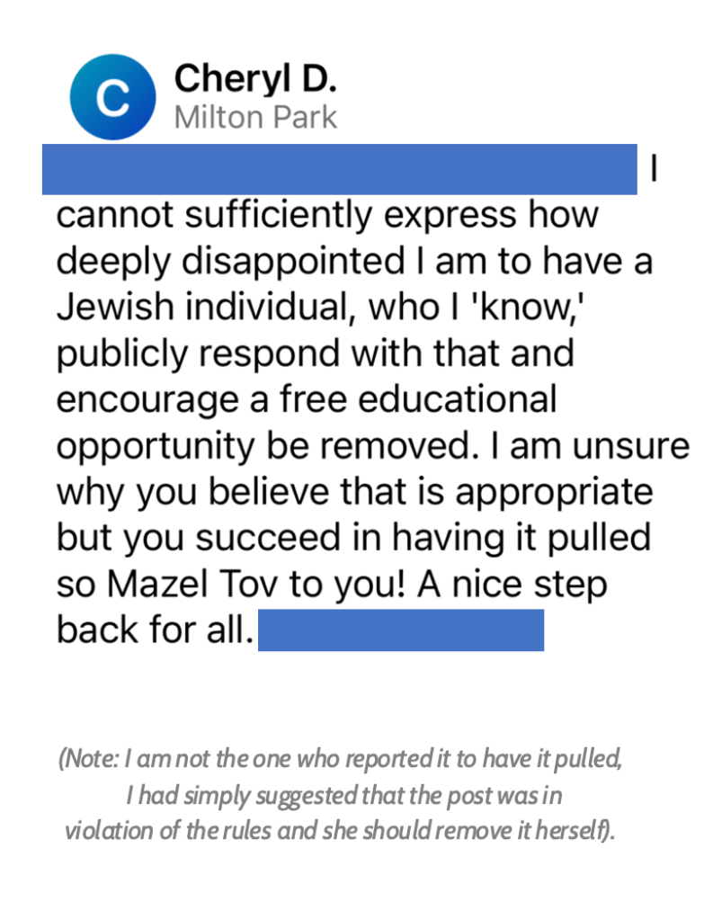 On a non-Jewish platform, which has strict rules about only posting content related to local events, I commented about this rule on a post by Jewish communal leader Cheryl Dorchinsky of Atlanta Israel Coalition regarding a national program her organization was co-sponsoring. In response, I immediately received a private message from Cheryl that escalated quickly in tone and intensity (see excerpt). The exchange did not reflect a simple disagreement about rules. It felt disproportionate and personal.