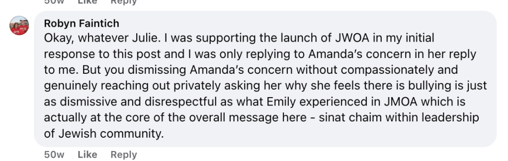 Ironically, in a discussion on Emily’s own Facebook post when this article was published, Julie attacked another commenter for her opinion about the toxicity in these two Jewish groups and when I responded, once again Julie took a bullying tone. My attempt at tochecha with her even back then: