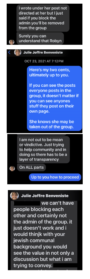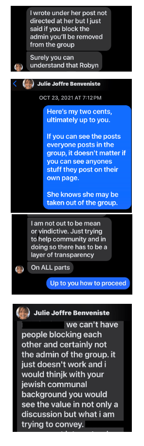 I had another private negative engagement with Julie after I was shown messages indicating that individuals were told they cannot remain in the JMOA group if they have Julie personally blocked on their private accounts, despite this not being a stated rule. When I told her I didn’t agree with her stance on this, her response was hostile (excerpts provided). I cannot verify the full scope or frequency of times she told people of this “rule,” but their existence reflects the degree to which personal authority and communal access have become intertwined.
