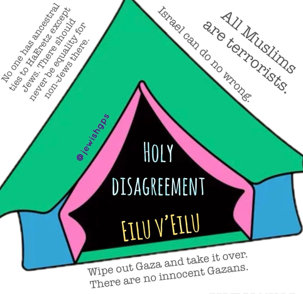 I know that the tent is different for each person and I implore people to figure out what unholy words or ideas you won’t tolerate – about Israel and the Palestinian people, or about any other complicated situation and then set those boundaries very clearly.