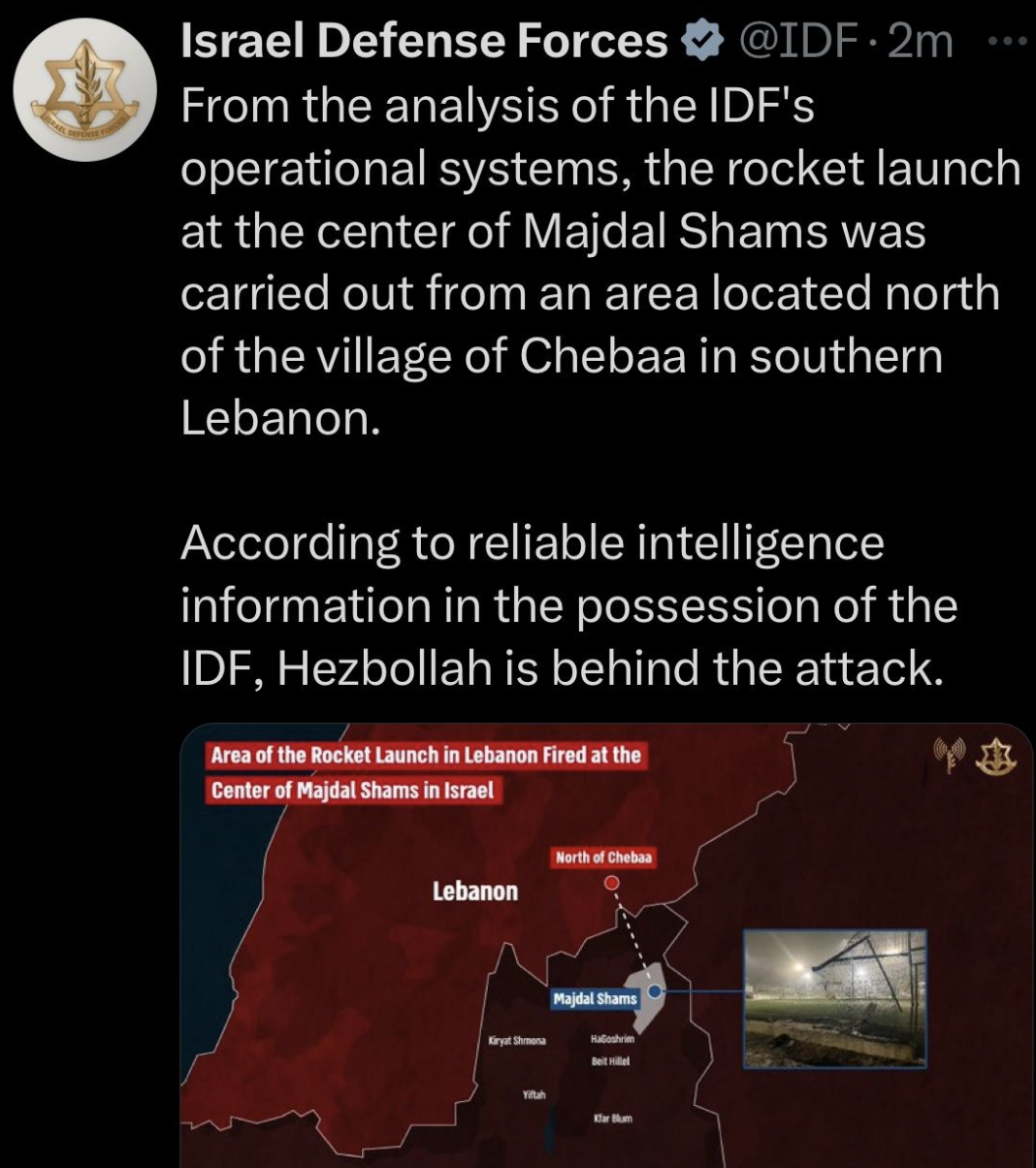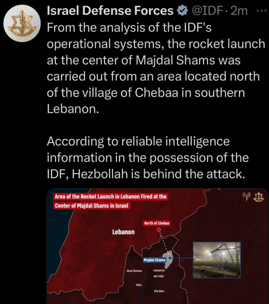 Today, a Druze village (not his specifically) fell victim to a missile attack from Hezbollah. A rocket manufactured by Iran, fell on a soccer (aka football) field, killing 11 children and teens. Israeli citizens. Futures cut short by a regime aimed at wiping Israel off the map.